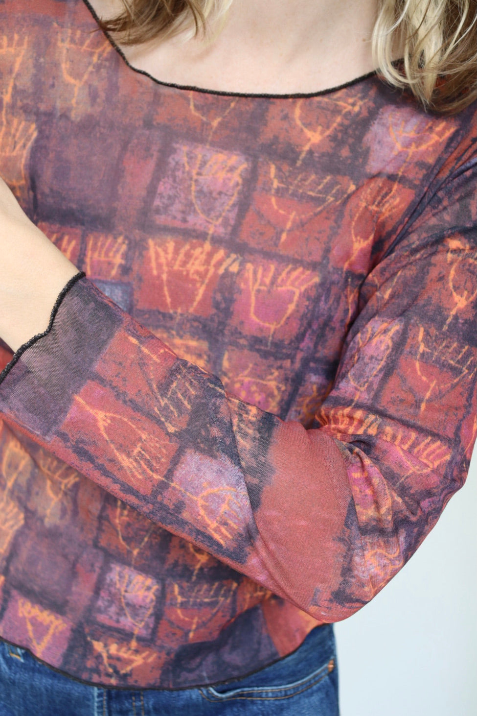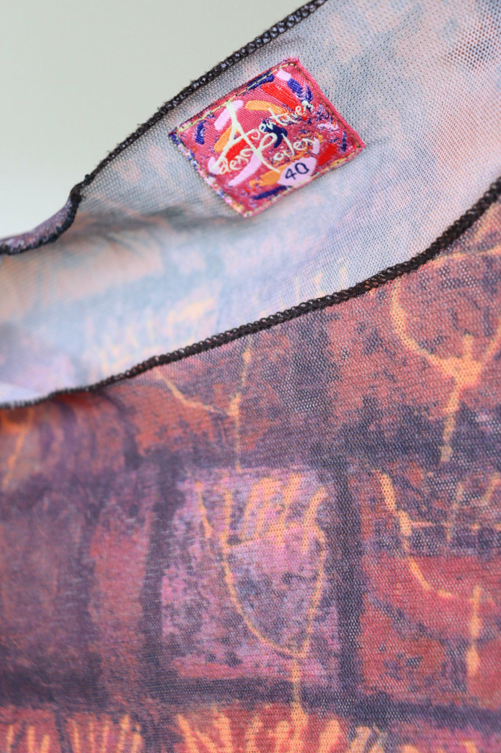 This 90's mesh top is from the brand "Adventures Des Toiles' where fashion becomes art to wear in everyday life. This French Brand is international known and is totally founded on art: for each season Aventures Des Toiles chooses paintings/photos/sculptures of contemporary French artists and transforms them into Prints on the fabrics, original and out of the usual patterns, Aventures Des Toiles combines art with the Prét-à-Porter.