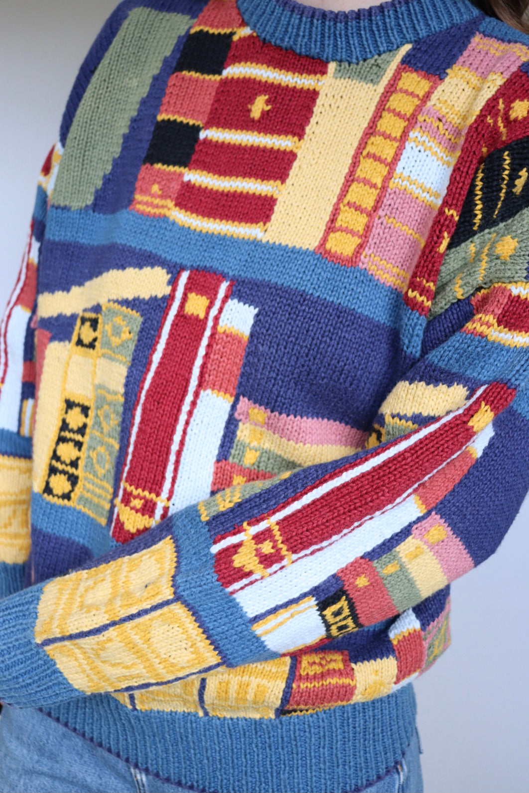 One of the best sweaters we have ever found! A vintage Avanti cotton / ramie knit for book lovers! This knitted sweater features shelves of colorful books. It is a whimsical and fun piece that will make you stand out because it is so unique.