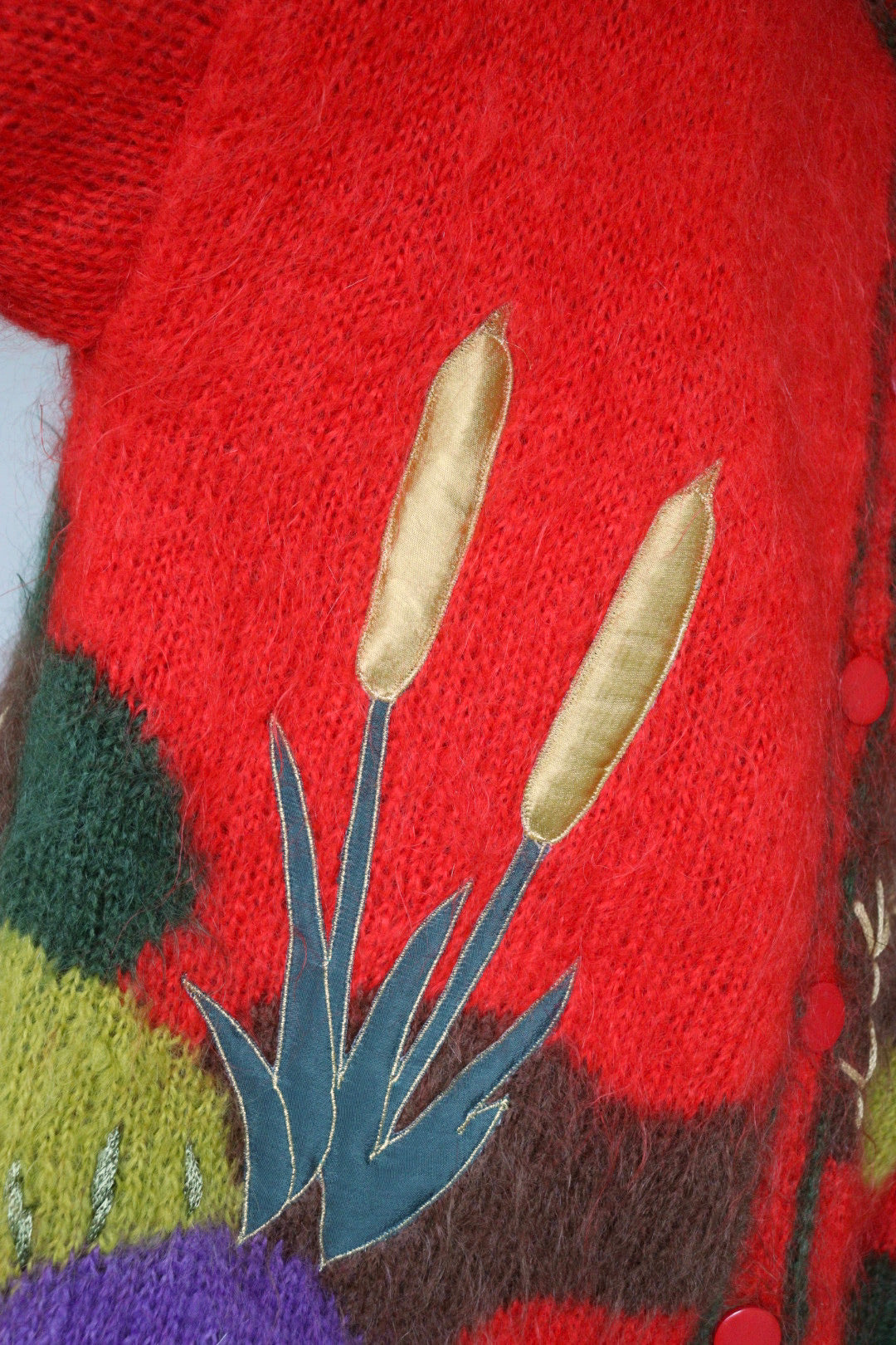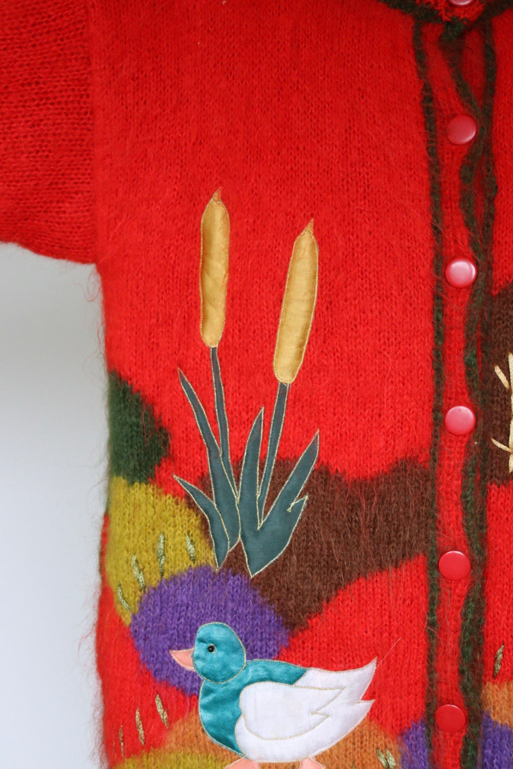 Soft and warm long cardigan with ducks in between bullrush plants, Norwegian Design from Bergen Norway. Fully lined for comfortable wear. Vibrant colors and original design.