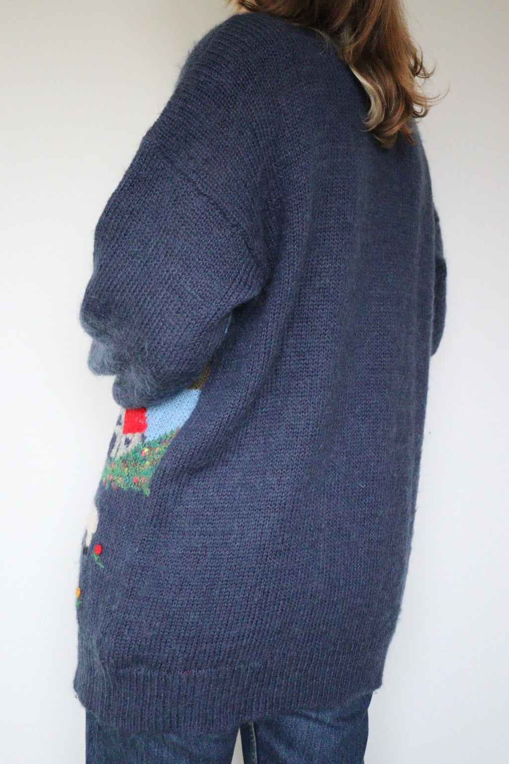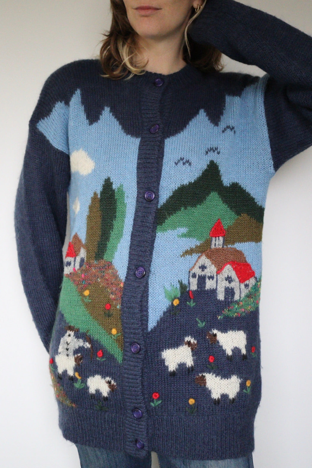Amazing long cardigan with the cutest little landscape, sheep and houses.