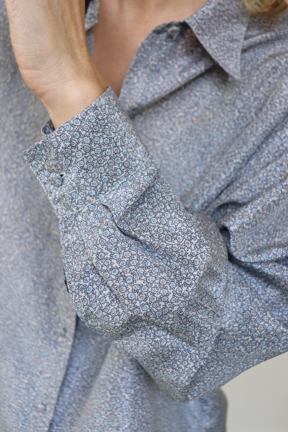 Silk blouse with tiny floral print in all the colors blue, buttons in the same fabric, Cacharel never disappoints.