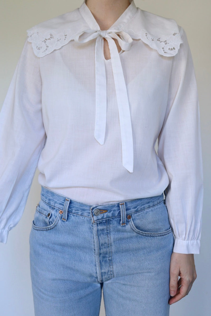 White cotton blouse with a large scalloped collar and necktie detail with delicate floral embroidery. Perfect for layering or wearing solo, wear it with a waistcoat or under a knitted sweater for a beautiful peter pan collar detail around the neck.