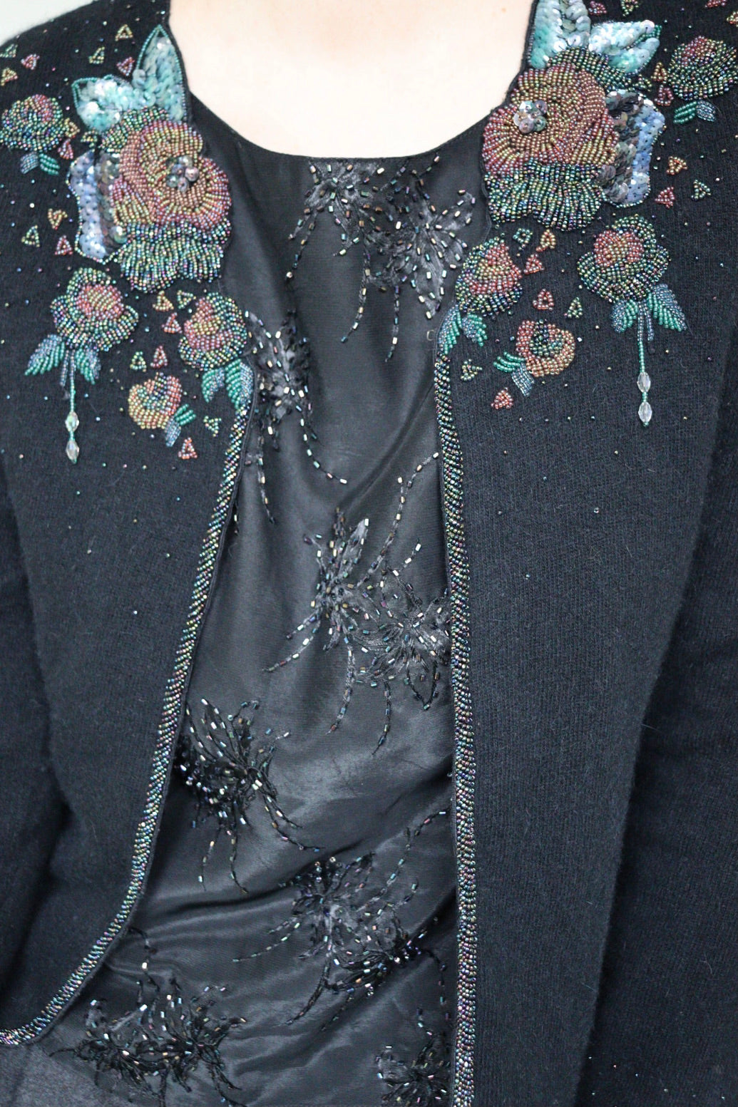 A work of beaded art, this wool cardigan with lining is bedazzled with delicate floral design made from beads and sequins. Beautiful collar with dangling diamonds. A cosy statement piece.