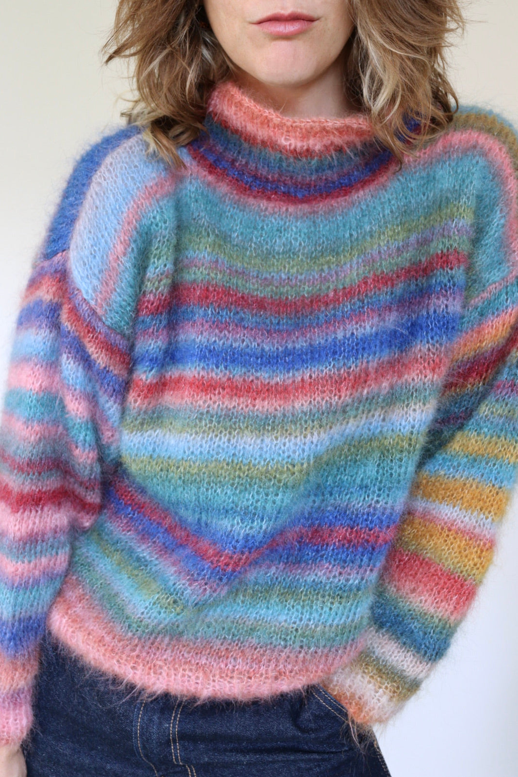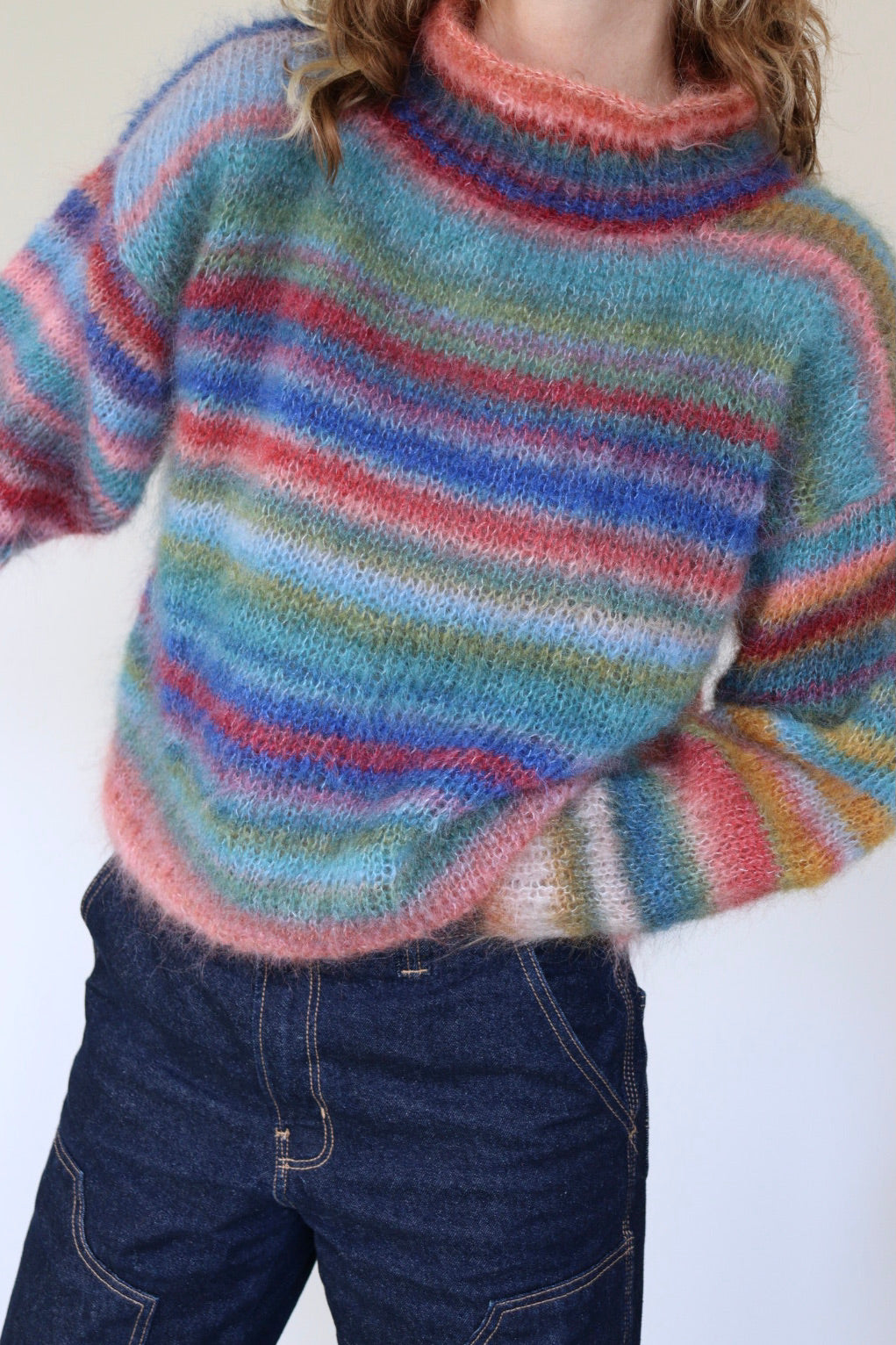 Multi colored striped fluffy mohair sweater, because of the box fit you kan wear this sweater on both sides so you can create two different looks.