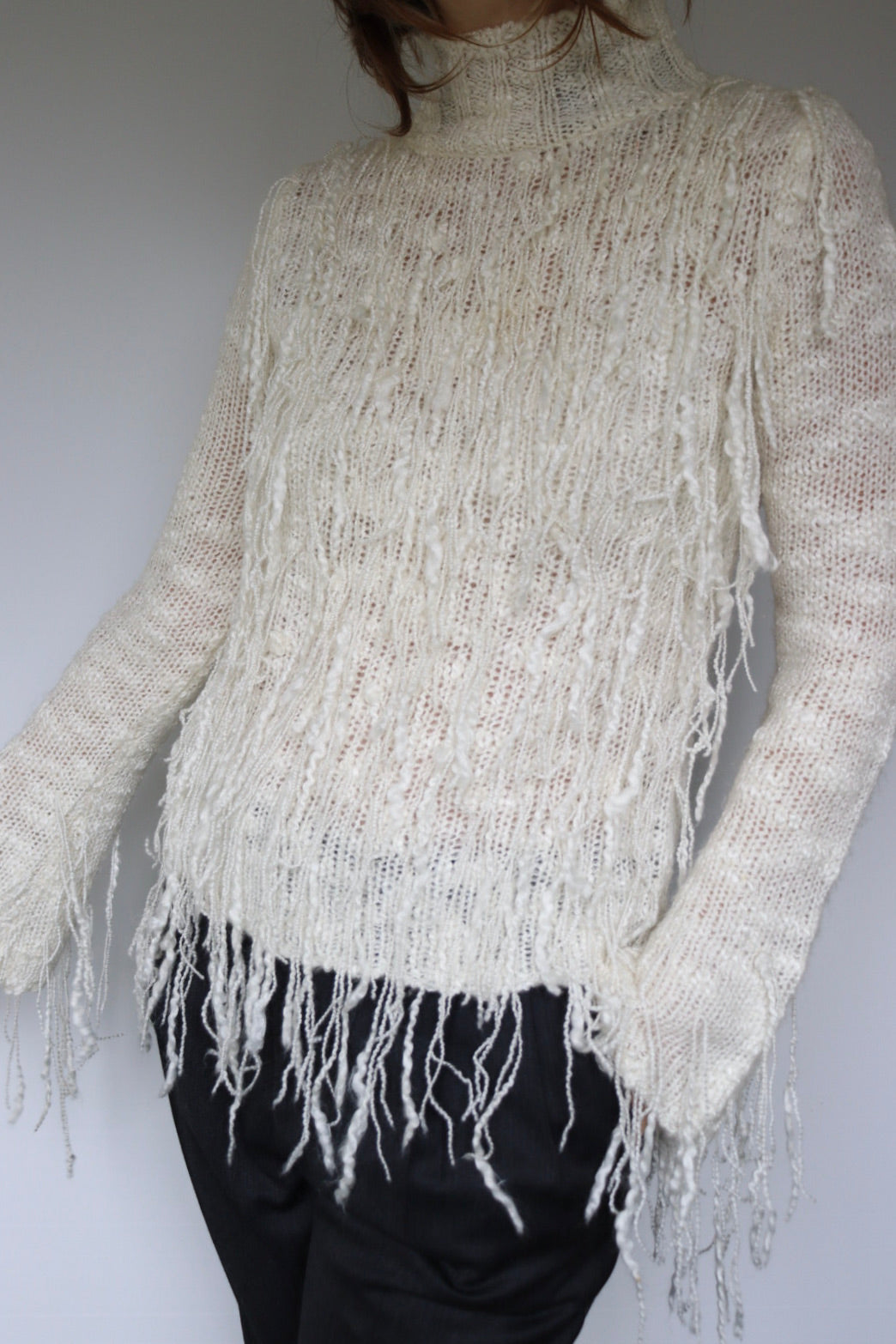 The brand René Derhy originated in 1969 and became famous for its vibrant, romantic styles and connection to the 70s hippie movement. The brand is still going strong and reinventing itself. This playful knit is so much fun with all the movement from the fringe but can also be very chique.