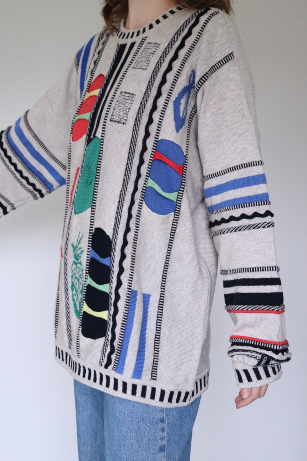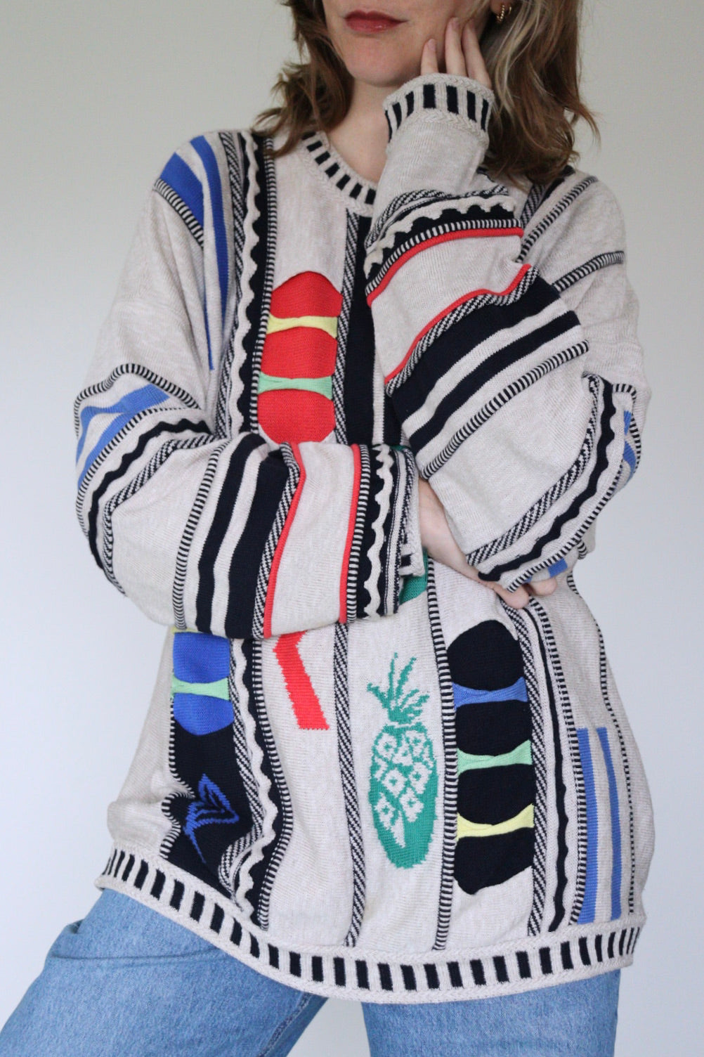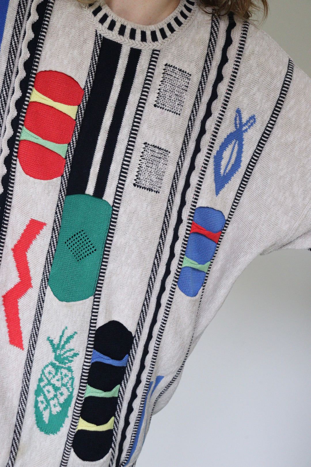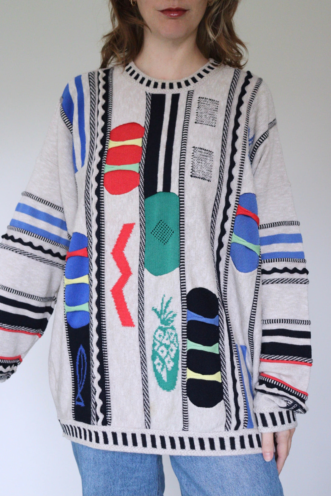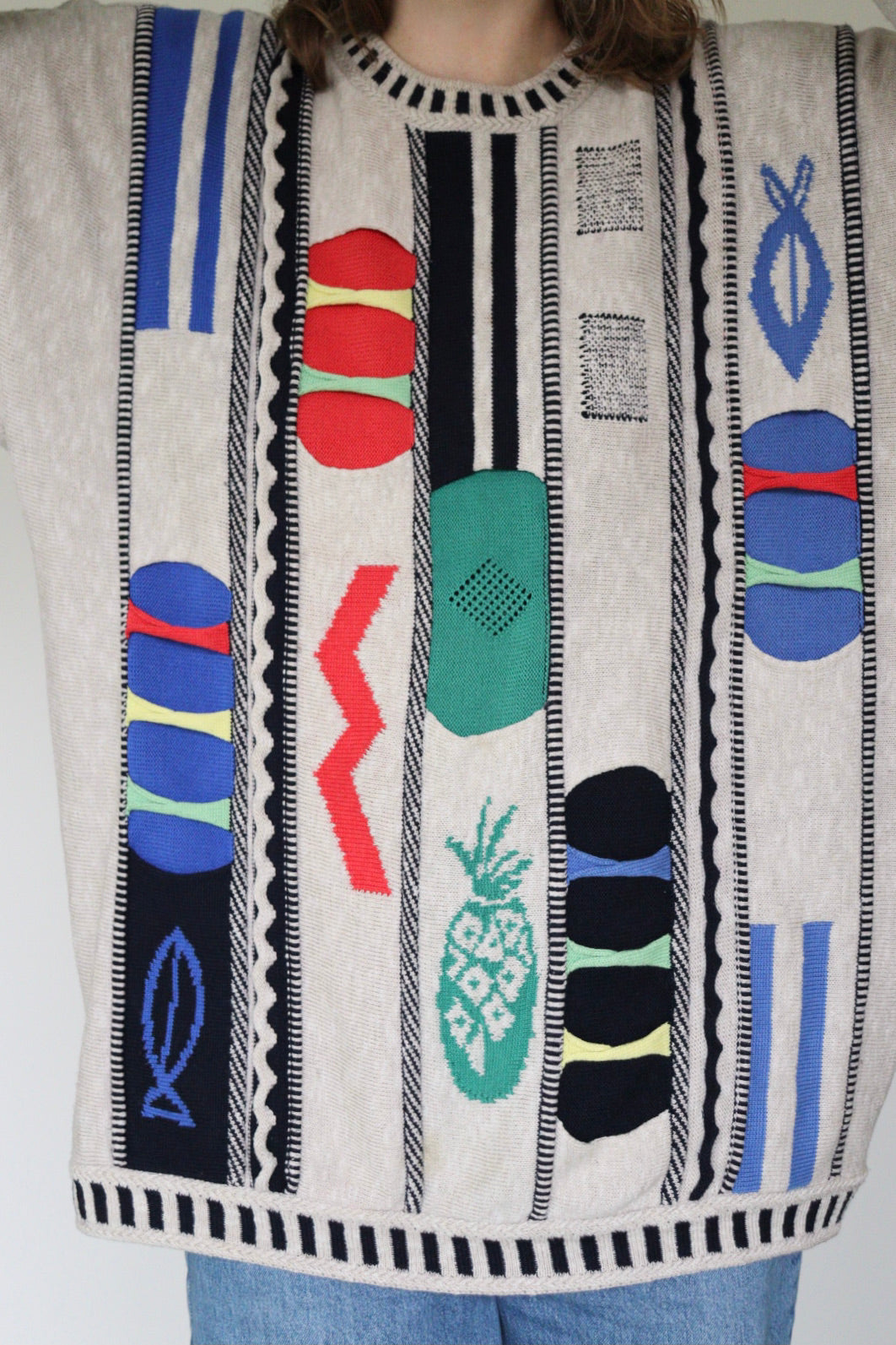 This vintage Carlo Colucci sweater is in perfect condition and the famous knitting technique is in full display with fish and 3D and even a pineapple. In the 70's Carlo Colucci was established in a fashionably very extroverted time. The knitted sweater was outstanding in its processing techniques and color combinations, which were never used before. This soon turned out to be a must-have piece and became a trademark itself. Original products from the 80's and 90's have become collector's items - a phenomenon that is unique in this industry. Such a cult is only born from history combined with high quality products.