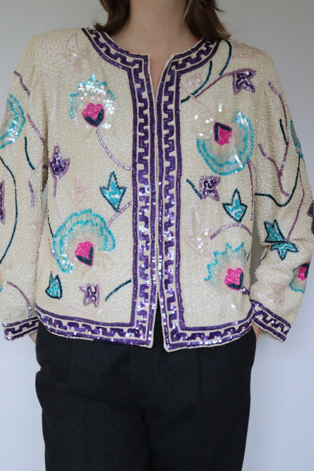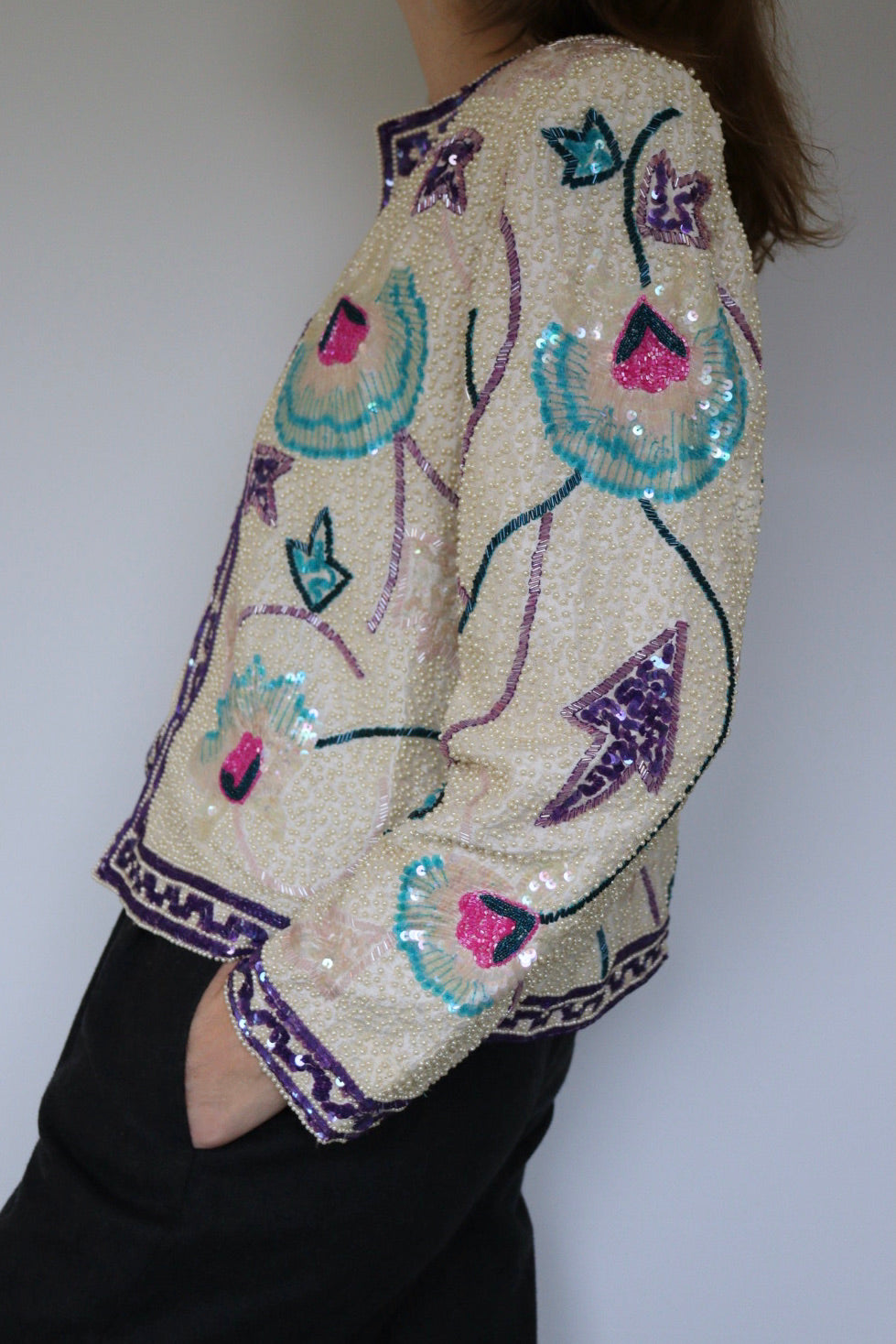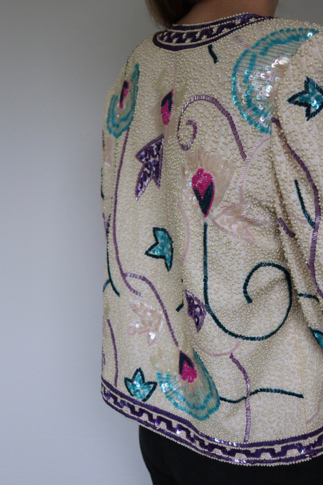 Incredible jacket covered in pearl beads and sequins in a floral pattern, made in India in perfect condition. A statement piece for sure that you can wear to all sorts of festive occasions. Best dressed at the party!