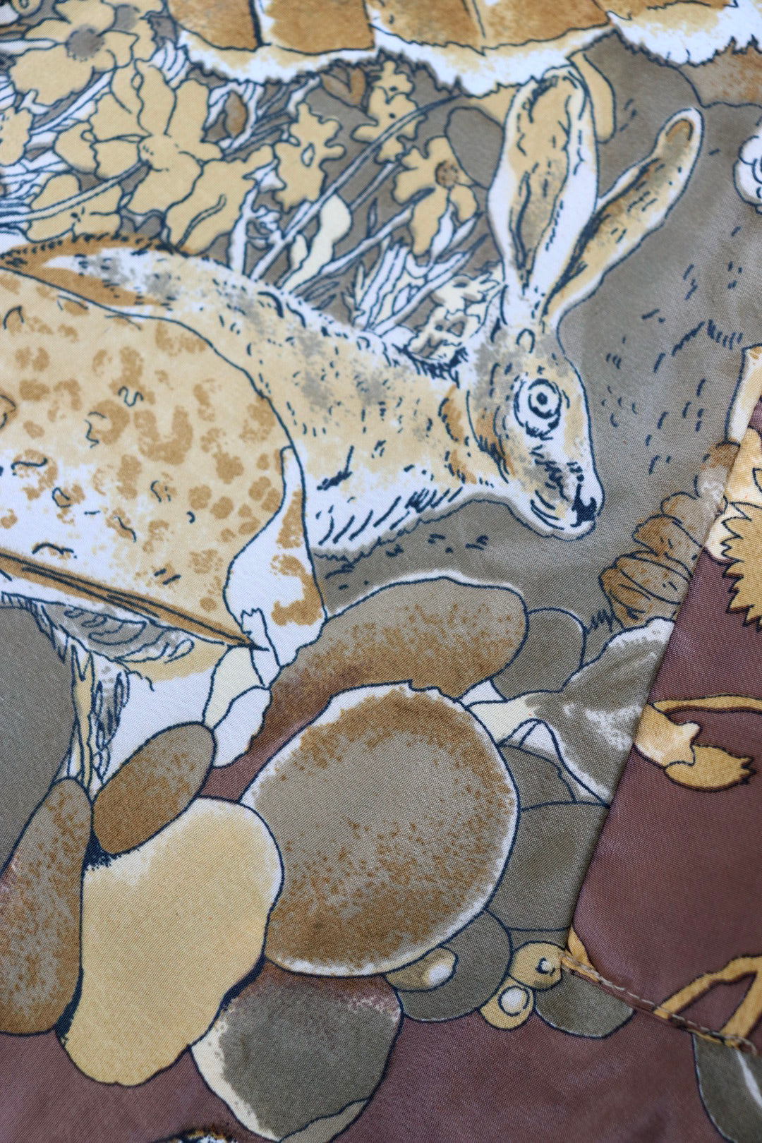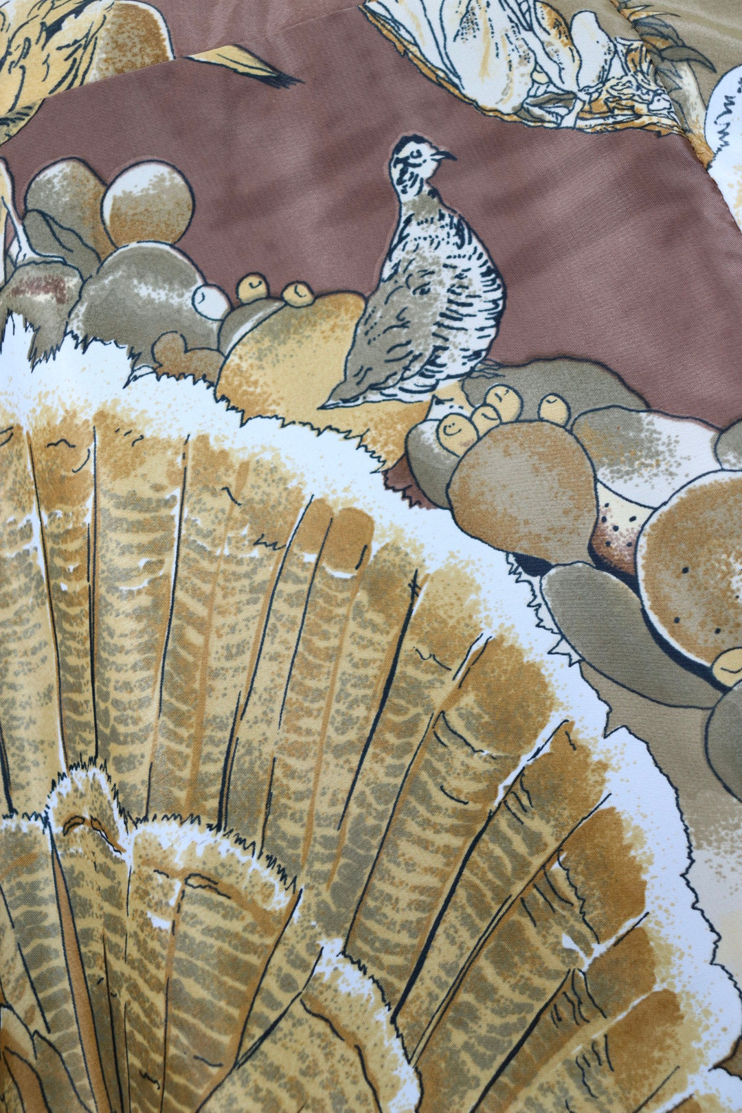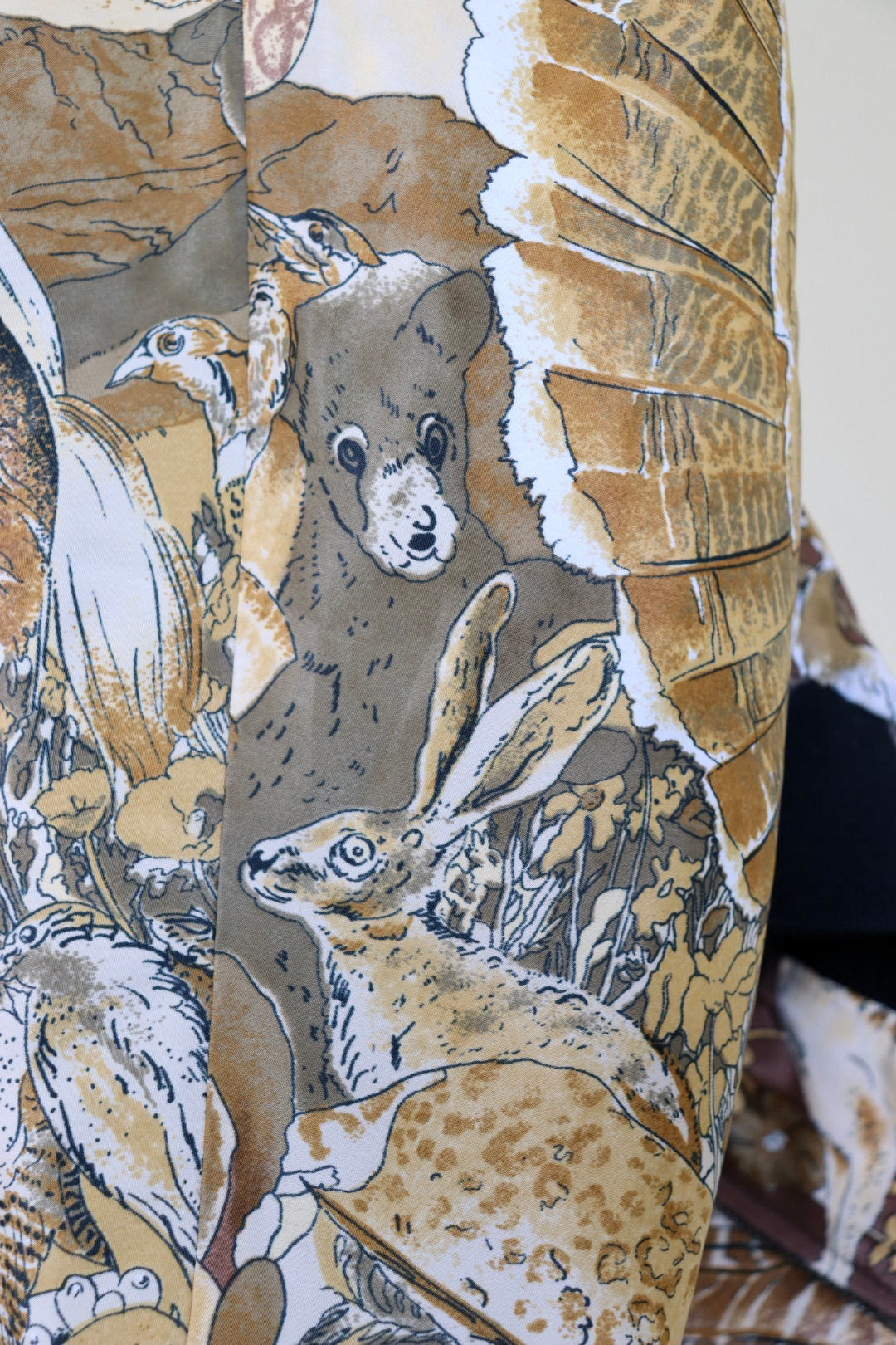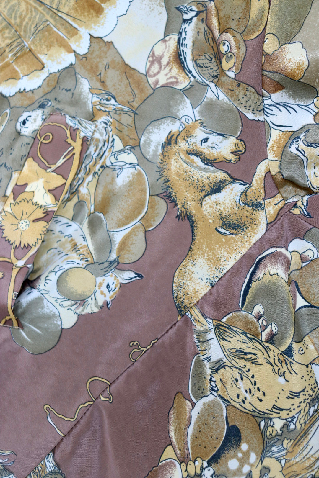 Fantastic bomber jacket in silk material outside and quilted interior. Neutral brown and golden colors with a very exceptional design. A turkey surrounded by nature elements and many different animals. At first the pattern seems simple, but when you look closer it is so detailled, a very special piece.