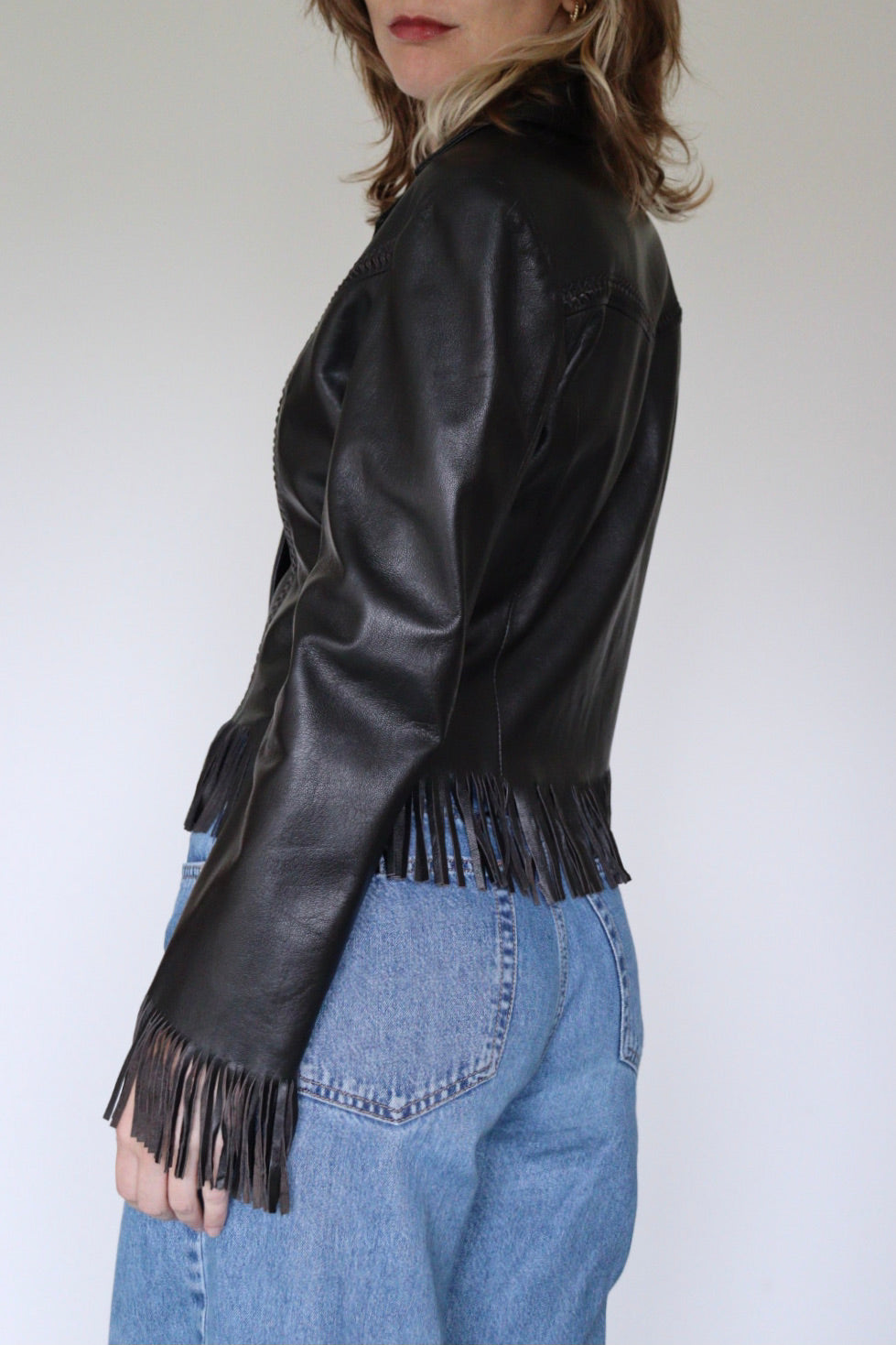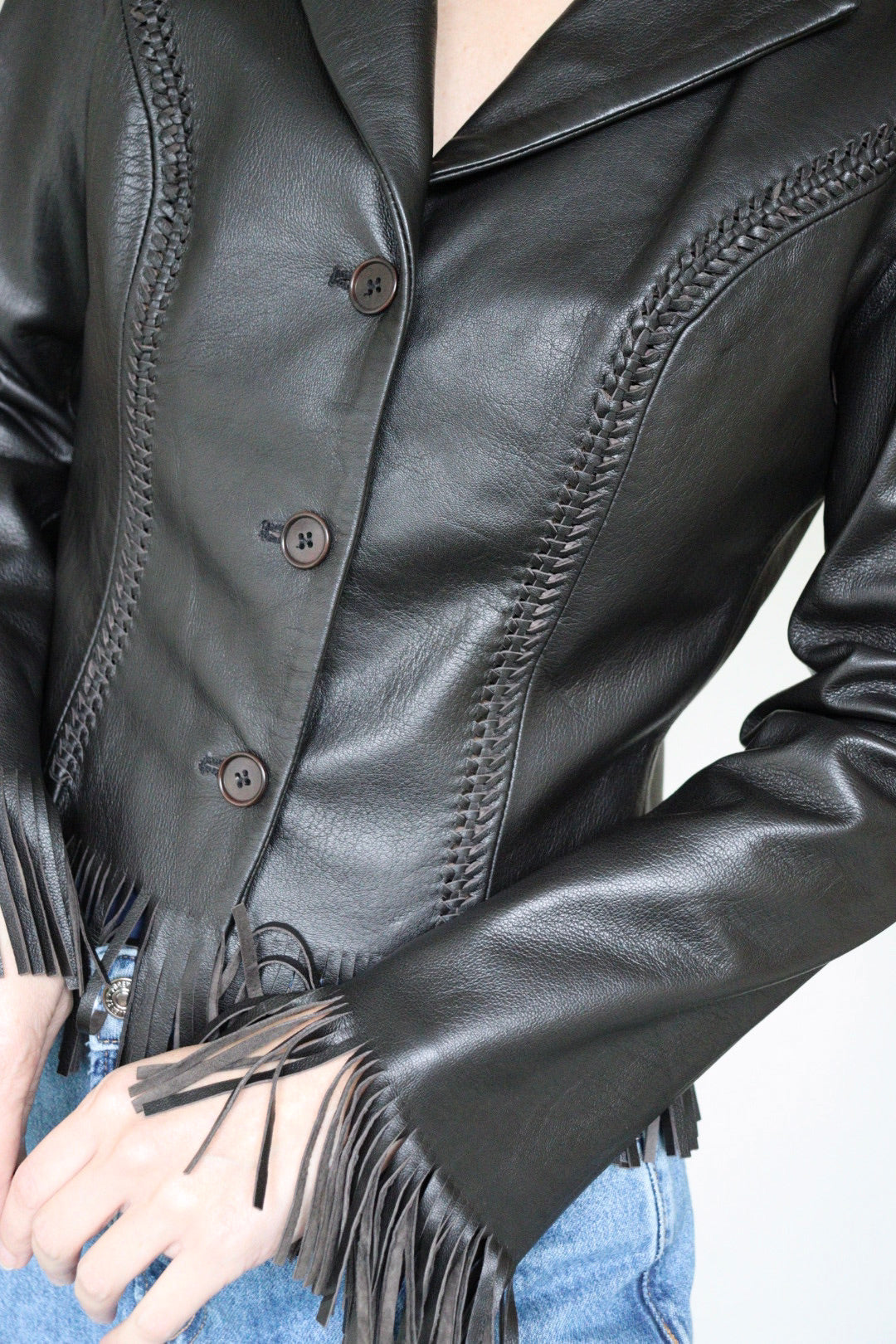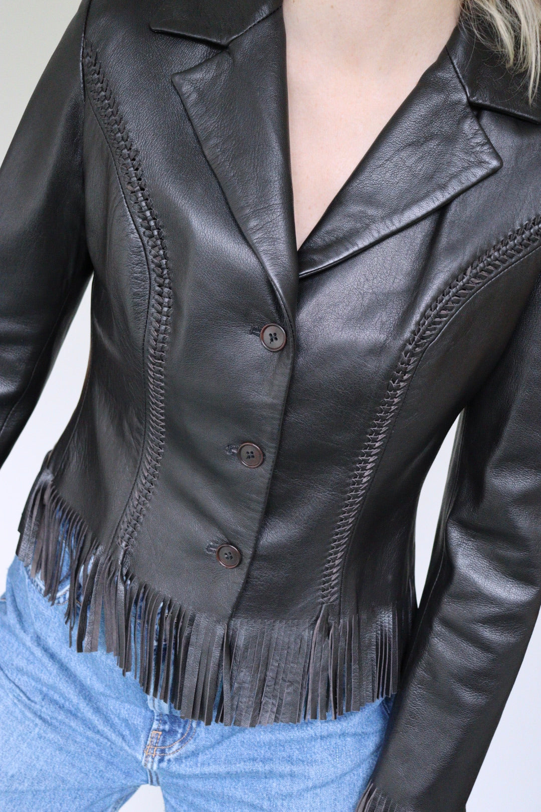 This dark brown leather jacket combines playful fringe details with a cool, edgy style. Add character and movement to your look with a subtle, stylish twist in quality leather.