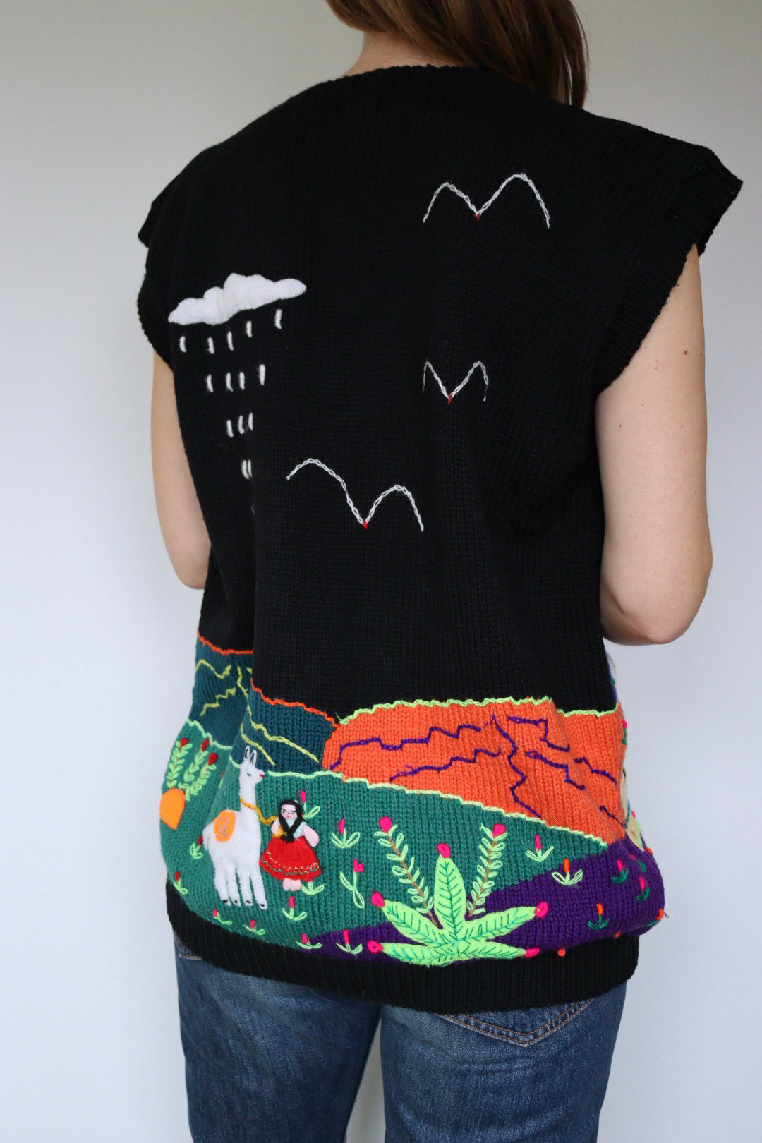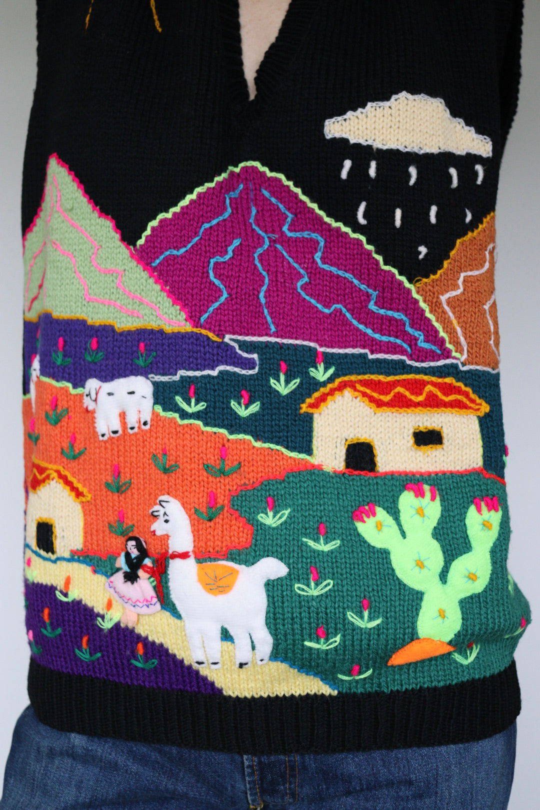 Peruvian vest with colorful landcape with alpacas, cacti, flowers and mountains.